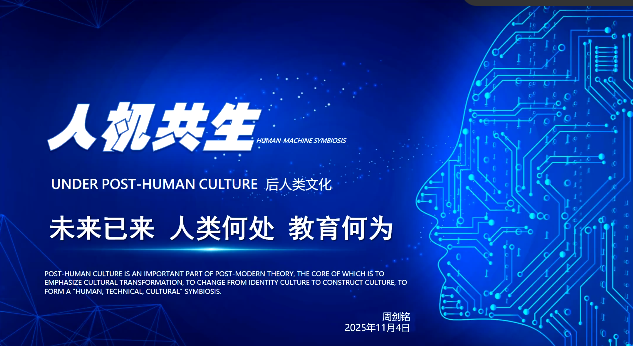 在理论层面,周剑铭老师系统梳理了 “共生理论” 与 “后人类理论” 的核心内涵。他指出,共生理论最初源于生物学领域,如今已扩展到社会层面,涵盖人与自然、人与机器等多元共生关系;而后人类理论则打破了 “人类中心主义” 的传统视角,强调跨物种协作的可能性,例如漫威宇宙中 “星际文明共生” 的设定,正是后人类文化 “多元协同” 理念的艺术表达。谈及 “人机共生” 的起源,周剑铭老师介绍,这一概念由计算机科学家利克莱德提出,其核心并非 “技术替代人类”,而是 “人与计算机深度协作、共同学习”—— 人类凭借创造力与情感理解能力把握方向,计算机依托算力与数据处理能力高效执行,二者形成 “1+1>2” 的协同效应。在分析技术对教育的具体影响时,周剑铭老师提出,数字时代的文化环境已发生显著变化:儿童不再主要通过文字接触世界,而是通过图像、短视频等数字化载体认知成人社会,这导致传统 “真善美” 导向的文化品性,逐渐向 “数据驱动、效率优先” 的方向转变。