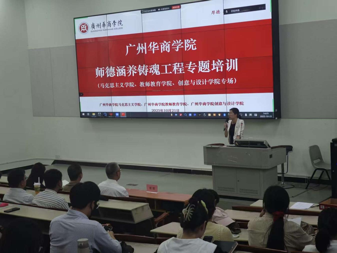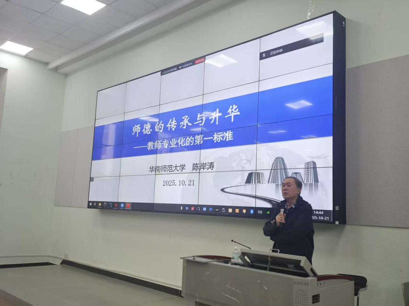 2025年10月21日下午,教师教育学院组织全体专任教师参与师德涵养铸魂工程专题培训。本次培训特邀华南师范大学教授陈岸涛主讲,以“师德的传承与升华——教师专业化的第一标准”为主题,为全体教师带来了一场兼具理论深度与实践指导意义的专题培训。