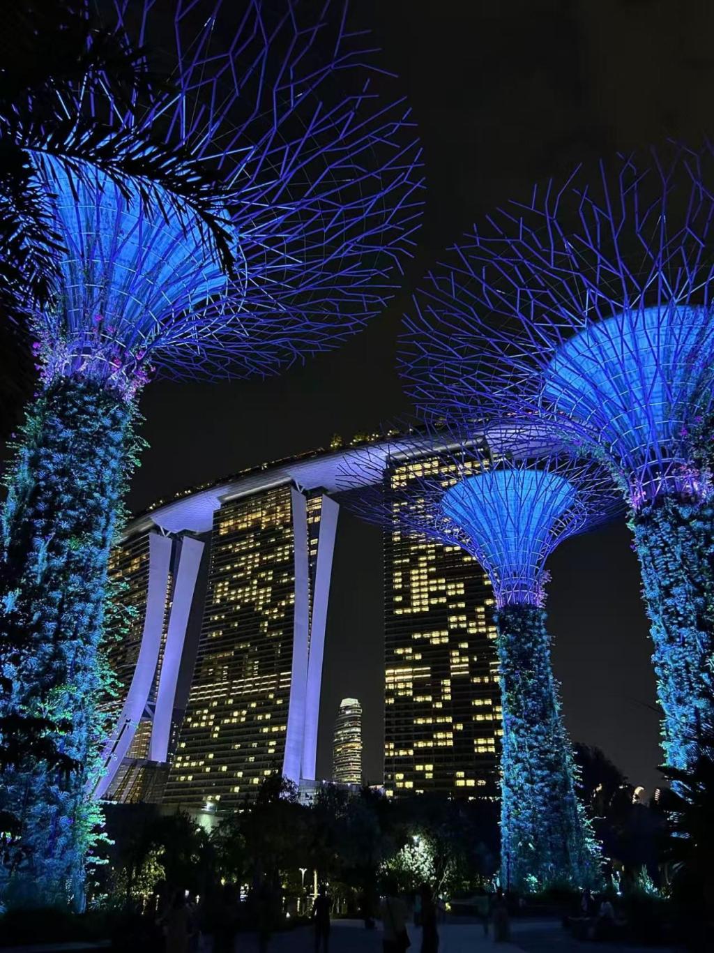 滨海湾花园的傍晚留给了擎天树与灯光秀。下午先钻进云雾林,看室内瀑布从六层高处倾泻而下,整点喷雾升起时仿佛闯入仙境;傍晚在22米高的空中步道俯瞰全景,夜幕降临时,灯光随音乐在树丛间流转,科技与自然的交融看得人挪不开眼。