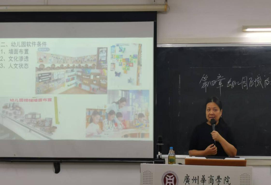 2025年10月16日,广州市增城区东江首府拓慧幼儿园秦丽园长受邀莅临广州华商学院,为学前教育专业师生开展《以环境育人——幼儿园区域活动环境创设实践智慧》专题讲座。本次活动通过理论阐释、案例解析、互动研讨三大板块,深化对“环境育人”核心价值的理解,为培养新时代幼教人才提供实践范本。