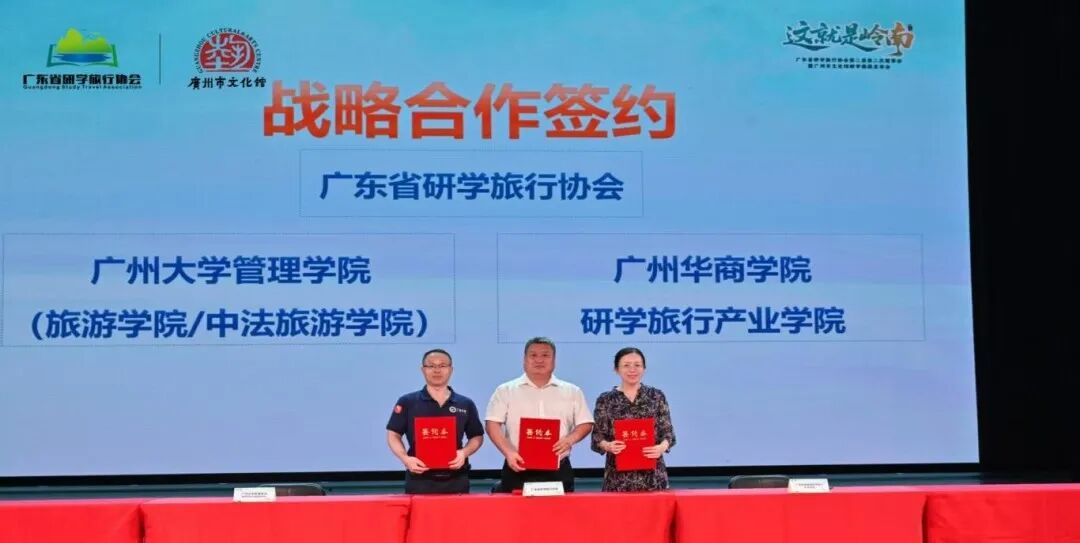 2025年7月9日,广州华商学院研学旅行产业学院受邀参加广东省研学旅行协会第二届第二次理事会暨广州市文化馆研学课程发布会。会上,学院正式增补为广东省研学旅行协会副会长单位,并与省研学旅行协会签订《深化校协合作、产教融合框架合作协议》,此次合作在校领导的统筹指导、产教办的协调推进以及管理学院、教师教育学院的大力支持下顺利达成。 这标志着学院在研学旅行领域的行业影响力与产教融合实践迈上新台阶。这一重要举措既是对学院在研学旅行领域专业实力与行业贡献的认可,更是深化产教融合、推动校协联动的关键一步,为培养高素质研学旅行人才、促进行业高质量发展注入新动能。